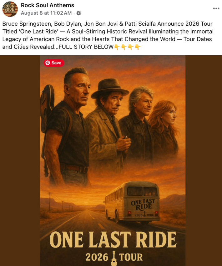 The latest example is a viral Facebook post claiming Bruce Springsteen, Bob Dylan, Jon Bon Jovi, and Patti Scialfa will join forces for a massive 2026 tour called One Last Ride.
