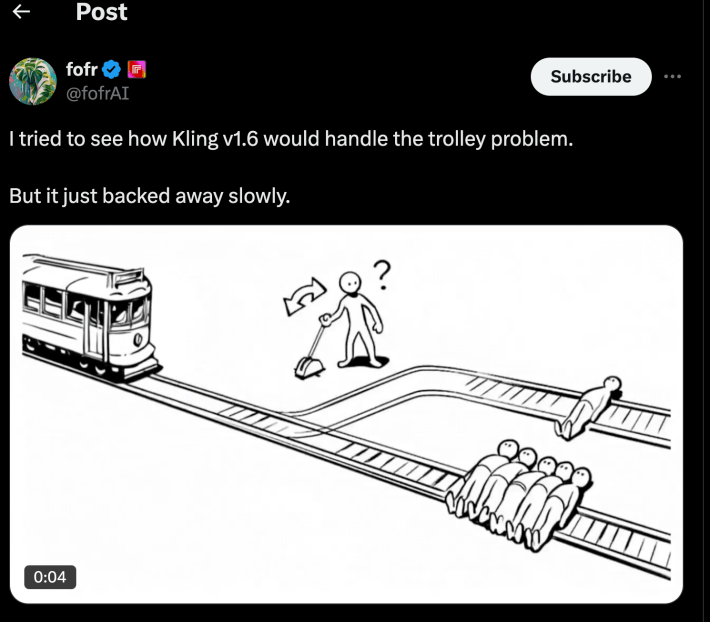 @fofrAI works in the field for the AI infrastructure provider Replicate and says “I've found AI funny before, but usually when it's being accidentally absurd.” They started their X account in 2022 as a way of showcasing the things they were making and building at work, but they were surprised by Kling 1.6’s response to their prompt:" > a man decides whether the trolley runs over one person or many people."