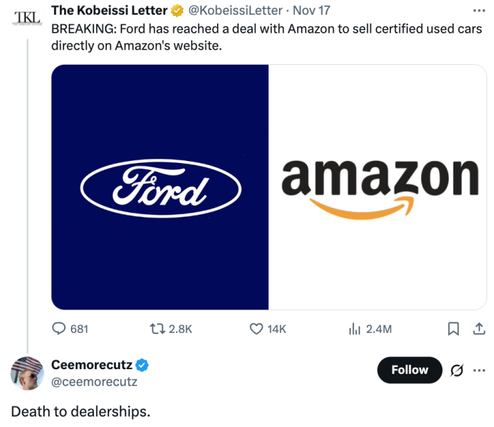 "This is an interesting development. This industry was in dire need of an overhaul, so I'm curious to follow where this goes. I once had to threaten to call the police when a big-name dealer in my area held my trade-in keys hostage, trying to strongarm me into a deal I didn't want," one X user writes.
