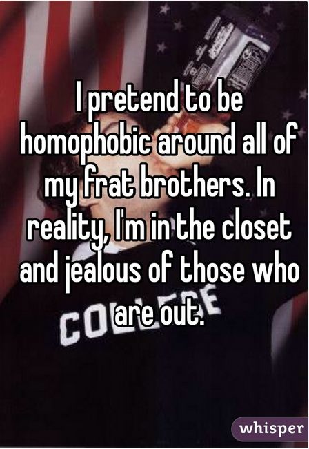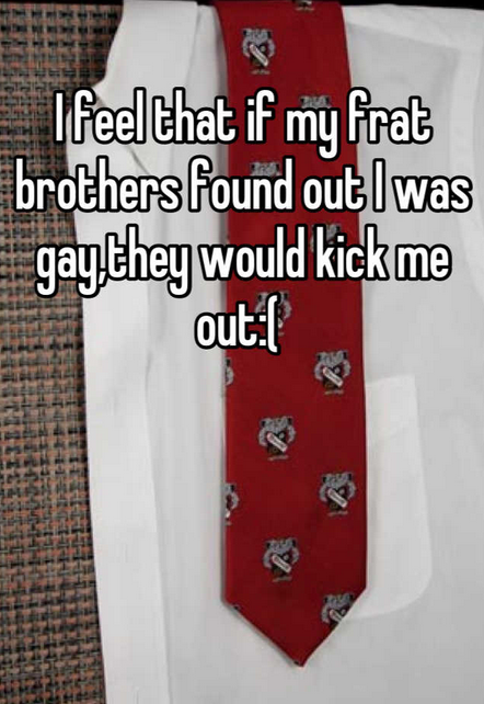 Browsing through Whisper entries about frats, it looks like some frat guys are doing more than just divulging their dorky hobbies or complaining about the frat culture: They’re also using Whisper as a way to test the waters when it comes to gay hookups, or as a full-fledged alternative to Grindr.