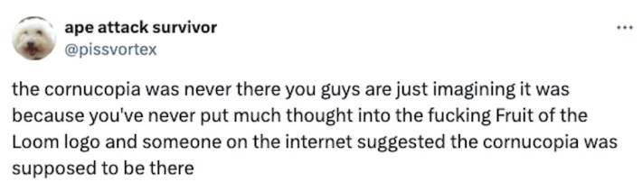 Get this - the Fruit of the Loom logo doesn't have a cornucopia in it... yet a VAST majority of people remember it having one. No version of the logo ever had one. This is by FAR the strangest instance of the Mandela Effect I've seen. Why do so many people remember one??? pic.twitter.com/wGx1be0fIX