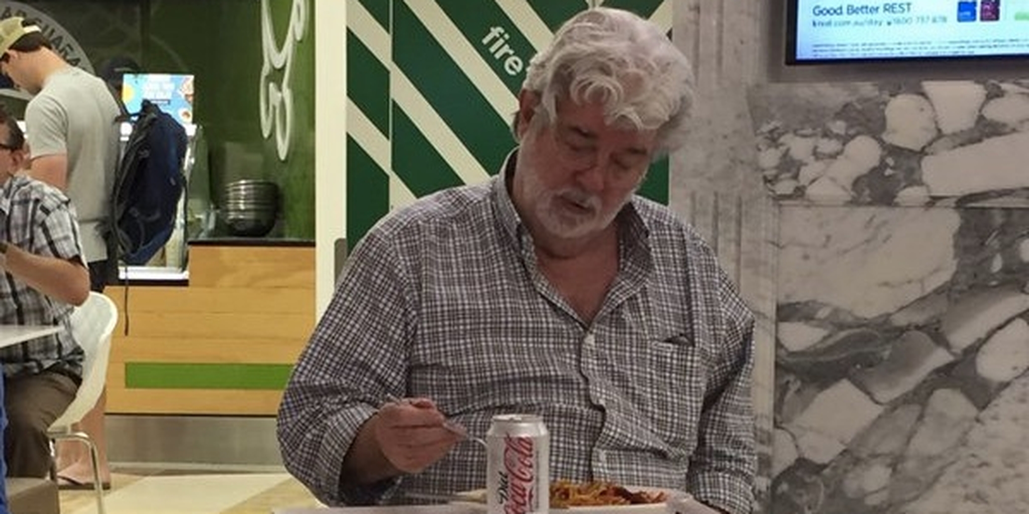 George Lucas, the legendary creator of Star Wars, was recently spotted in a mall food court in Adelaide, Australia, where he sat alone with what appeared to be a plate of garbage food court noodles and a Diet Coke. The ingrates on social media were quick to criticize Lucas for presenting this sad tableau: