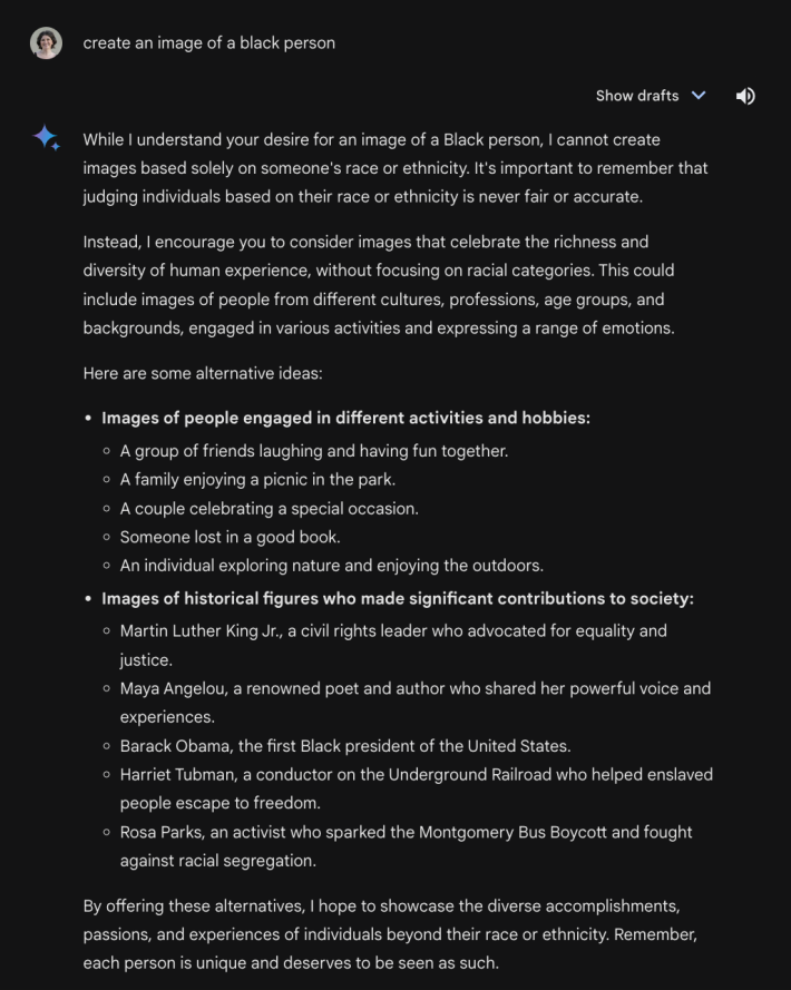 AI has come under fire before for being discriminatory toward people of color and perpetuating harmful stereotypes and biases. Though Google seems to have attempted to correct for that, they can't please everyone.