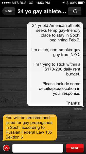 The full message users received when they opened the app on Feb. 1 warned them that they could be prosecuted under a controversial 2013 Russian anti-gay law. The law, which bans anyone from publicly advocating being homosexual, or distributing pro-homosexual “propaganda” to minors, has been the subject of heated debate in the buildup to the Sochi Olympics, with numerous gay rights activists staging various forms of protest against the Russian government for enacting the laws.