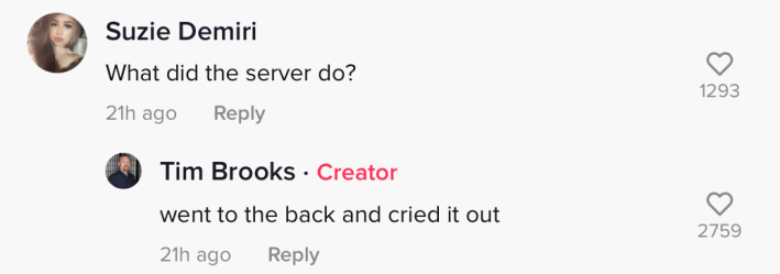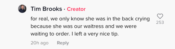 The poster, @majorhustler, shared that after the video, the waitress went into the back and "cried it out." The TikToker said he was also seated in her section and gave her "a very nice tip."