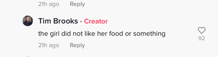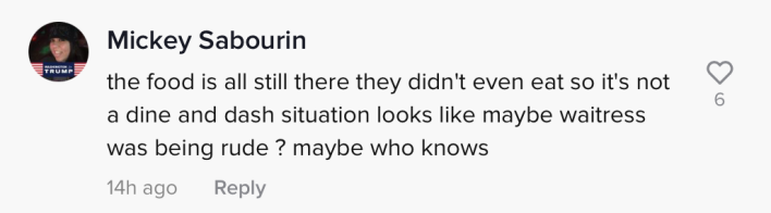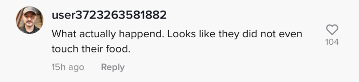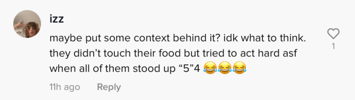 "Maybe put some context behind it?" one commenter wrote. "Idk what to think. They didn't touch their food but tried to act hard asf when all of them stood up 5'4"."