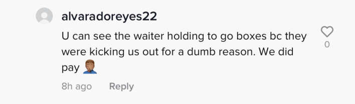 "U can see the waiter holding to go boxes bc they were kicking us out for a dumb reason," @alvaradoreyes22 wrote. "We did pay. Guy in the glasses payed for our meals. She wasn't being rude bc she didn't like her meal it's bc we were getting kicked out for something stupid."