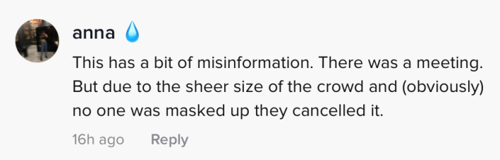 "This has a bit of misinformation," one commenter wrote. "There was a meeting. But due to the sheer size of the crowd and (obviously) no one was masked up they canceled it."