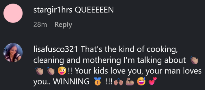 "That's the kind of cooking, cleaning and mothering I'm talking about!!" wrote @lisafusco321. "Your kids love you, your man loves you.. WINNING!!"