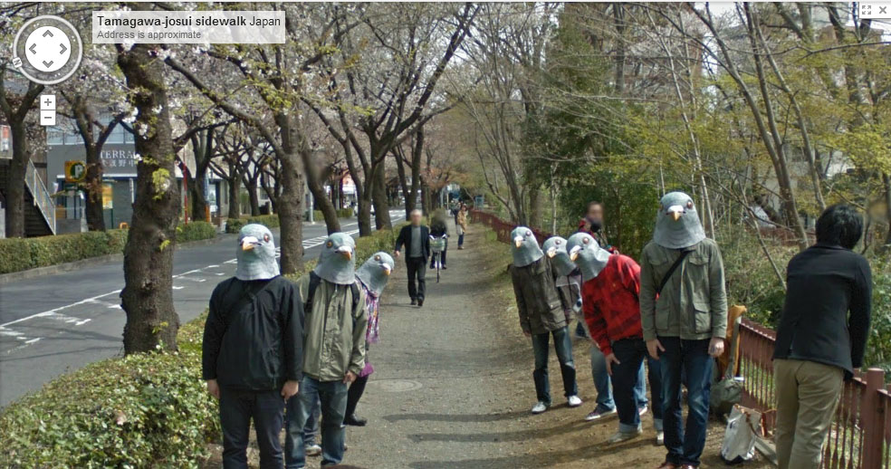 Google Street View has been plagued with privacy issues from the very beginning. While the faces of most pedestrians are simply blurred out, a group of people in Japan decided to mask their identity in a unique—and unnerving—way. Behold, the ultra-creepy "pigeon people" of the Tamagawa-josui sidewalk!