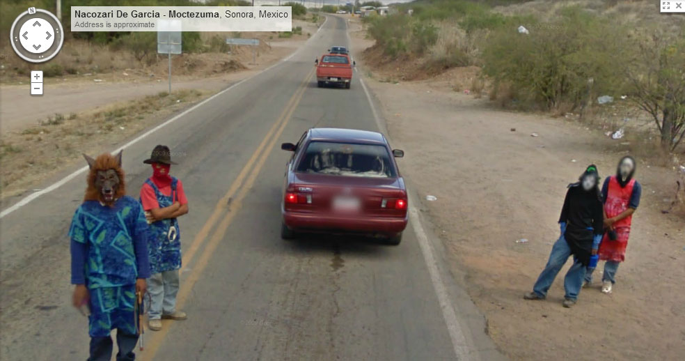Wearing anthropomorphic masks when the Google Street View car passes isn't limited to only Japanese citizens. If you ever find yourself on Nacozari De Garcia-Moctezuma in the Mexican state of Sonora, be on the lookout for the Wolfman, bank robber, and "Ghostface" from Scream.