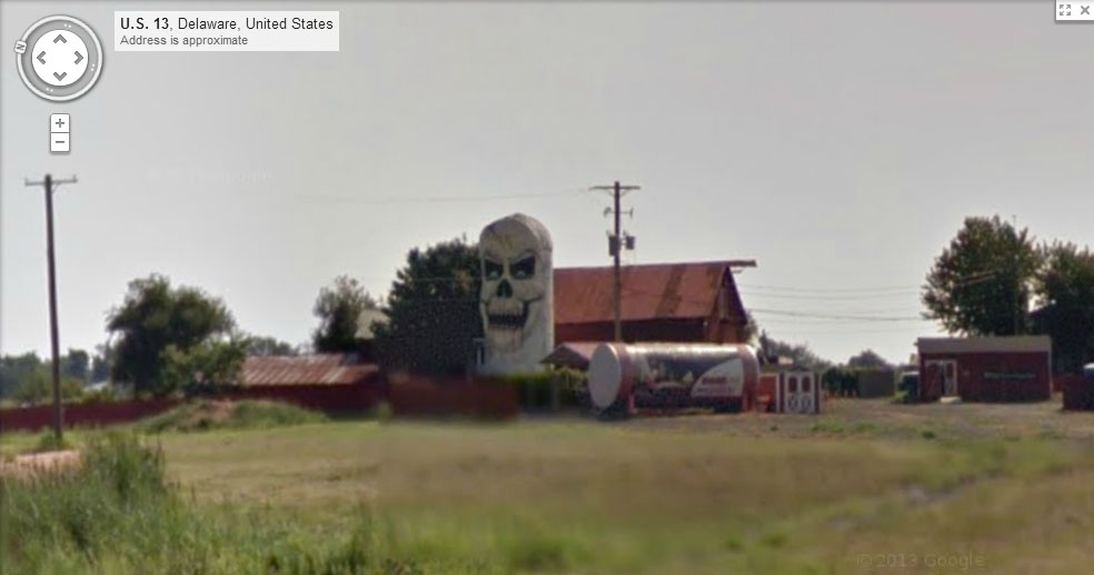 Frightland is a locally popular Halloween attraction along this stretch of Route 13 in Delaware. All year long, its property is guarded by a silo painted to resemble a grinning skull. As if this isn't creepy enough, the skull silo is outfitted with a giant Santa Claus beard in later seasons.