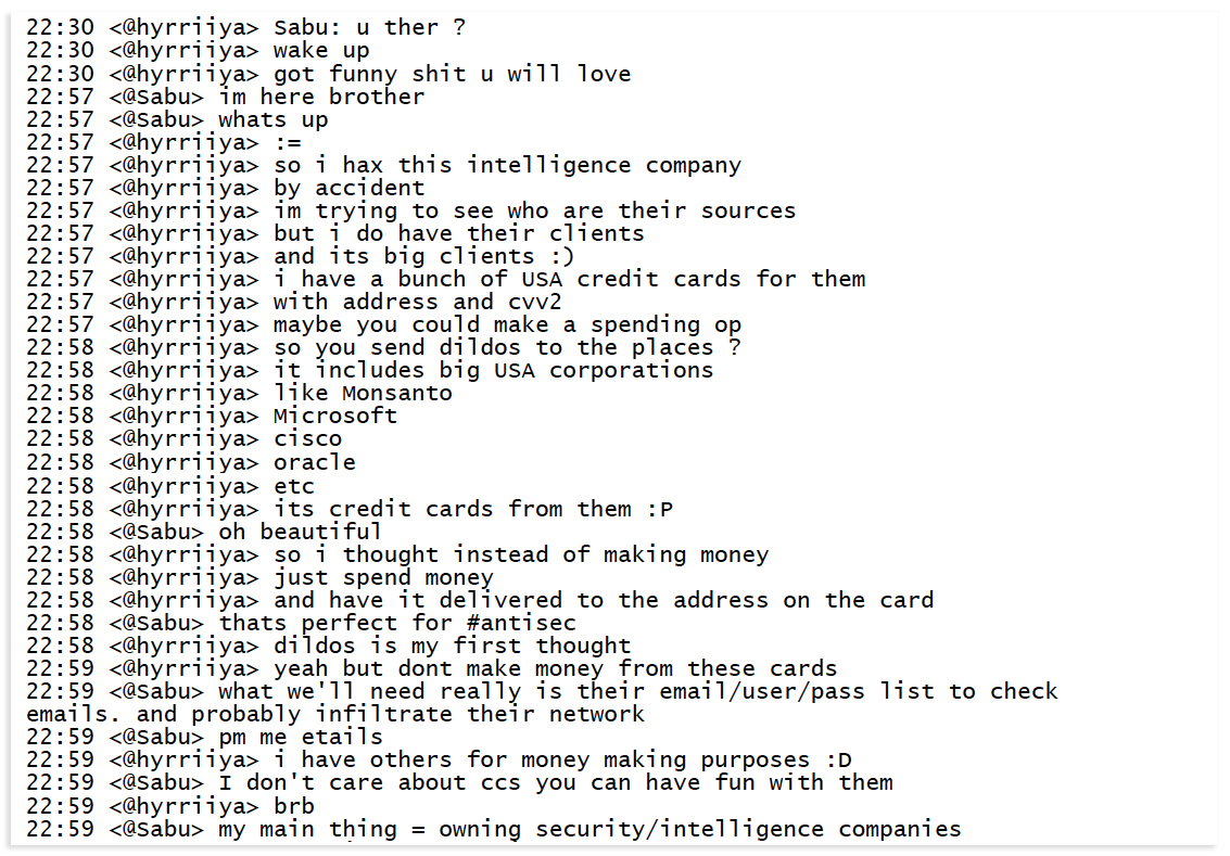 According to the chat logs, on Dec. 4, 2011, Hyrriiya informed Monsegur that he’d compromised the company’s systems. Monsegur responded, “That’s perfect for #antisec.” (“AntiSec” refers to hacking group that formed in the summer of 2011 as an offshoot of LulzSec, which was cofounded by Monsegur. The term itself comes from the Anti Security Movement of the early 2000s.)