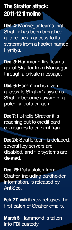 On Dec. 5, Hammond learns about Stratfor from Monsegur in a private message and is sent details for two stolen credit cards.