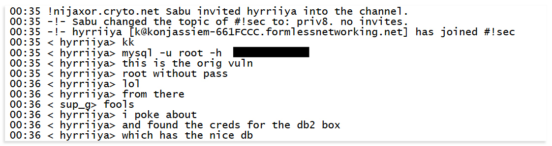 Approximately two hours later, Monsegur invited Hyrriiya into a private chatroom called "#!Sec," then frequented by Hammond and other members of AntiSec. Immediately upon entering the room, Hyrriiya disclosed Stratfor’s vulnerability to the group. Monsegur instructed them to “keep sensitive conversations” contained to the #!Sec room.