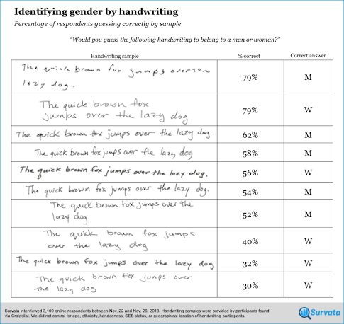 Online survey upstarts Survata recently asked consumers to decipher the gender of handwriting samples provided by people found on Craigslist. They used five male and female samples of the phrase “The quick brown fox jumps over the lazy dog,” and asked 3,100 respondents to identify the gender. And the results showed only 54 percent of those surveyed correctly identified.