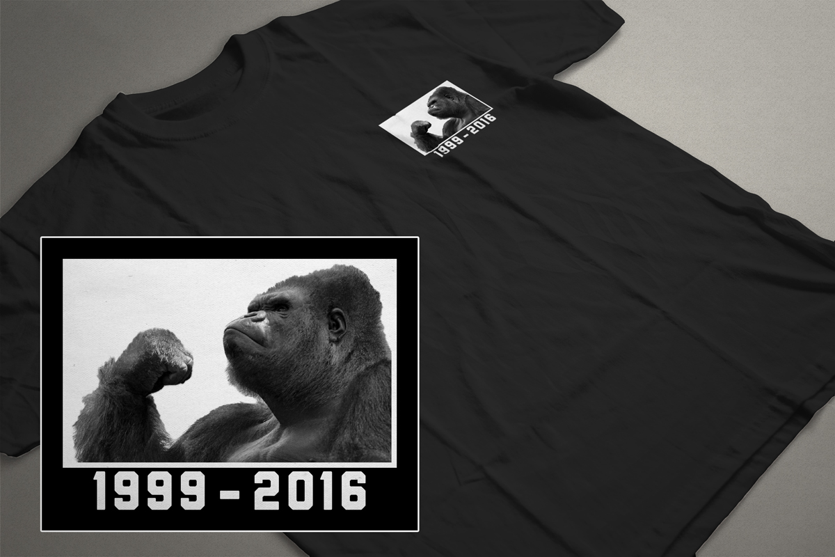 On the front, Harambe—who was shot in May at the Cincinnati zoo after a 4-year-old boy fell into his enclosure—is majestically honored, fist high in the air. This may be the best Harambe tribute to date. You can buy the shirt here.