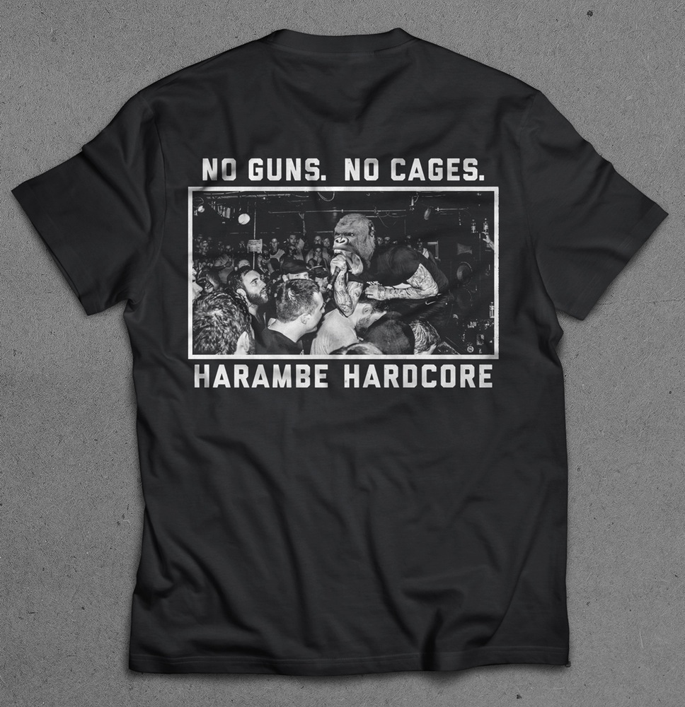 The back of the shirt reads, "No Guns. No Cages. Harambe Hardcore," framing a photo of tattoo-ridden Harambe latching on to microphone amidst a crowd of devoted fans in a mosh pit.