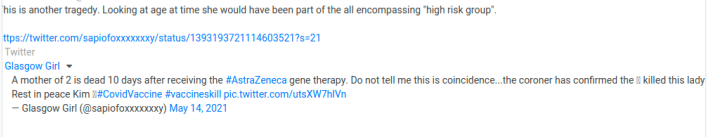 In May, one HART member shared a link to a tweet from @sapiofoxxxxxxxy that said “A mother of 2 is dead 10 days after receiving the #AstraZeneca gene therapy. Do not tell me this is a concidence...the coroner has confirmed the [unviewable emoji] killed this lady.”