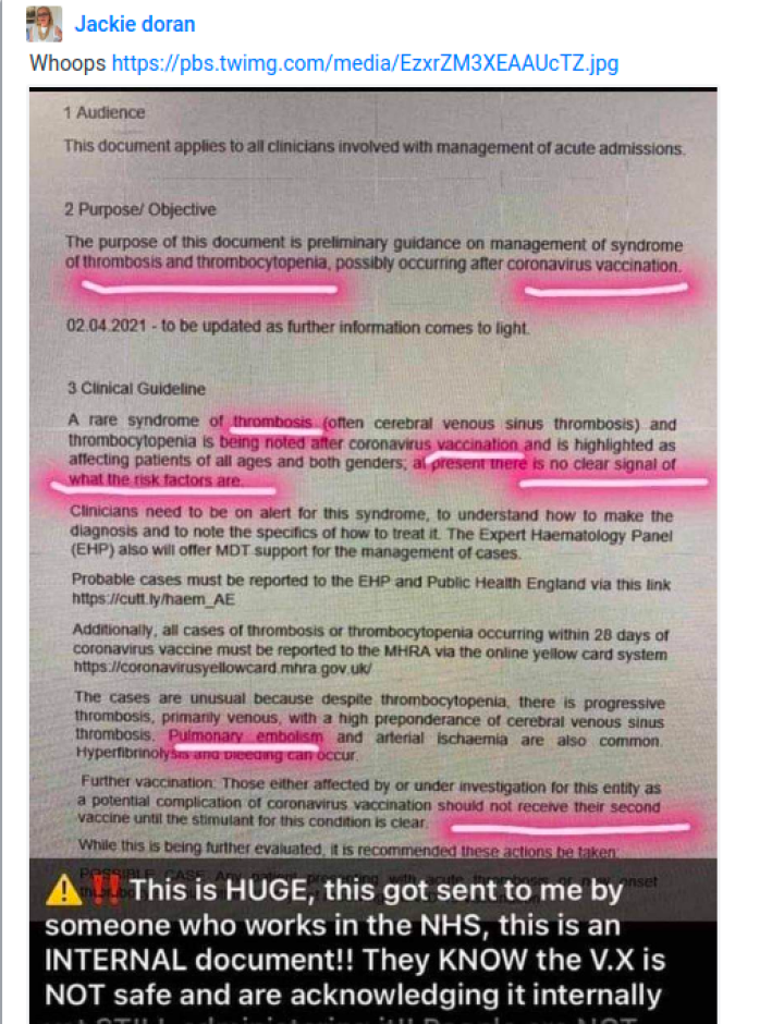 They shared a purported image of a document from "someone who works" in the U.K.s National Health Services. It claimed "They KNOW the V.X. is NOT safe and are acknowledging it internally."