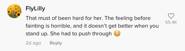 "That must of been hard for her," one wrote. "The feeling before fainting is horrible, and it doesn't get better when you stand up. She had to push through."