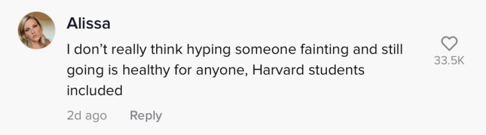 "I don't really think hyping someone fainting and still going is healthy for anyone, Harvard students included," another top comment reads.