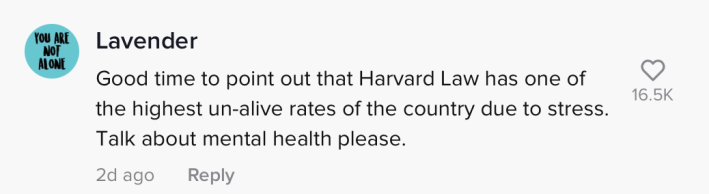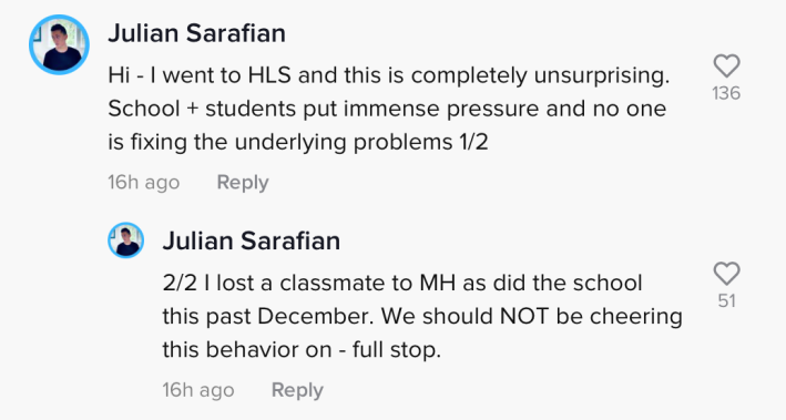 "I went to HLS and this is completely unsurprising," they wrote. "School and students put immense pressure and no one is fixing the underlying problems. I lost a classmate to MH as did the school this past December. We should NOT be cheering this behavior on——full stop."