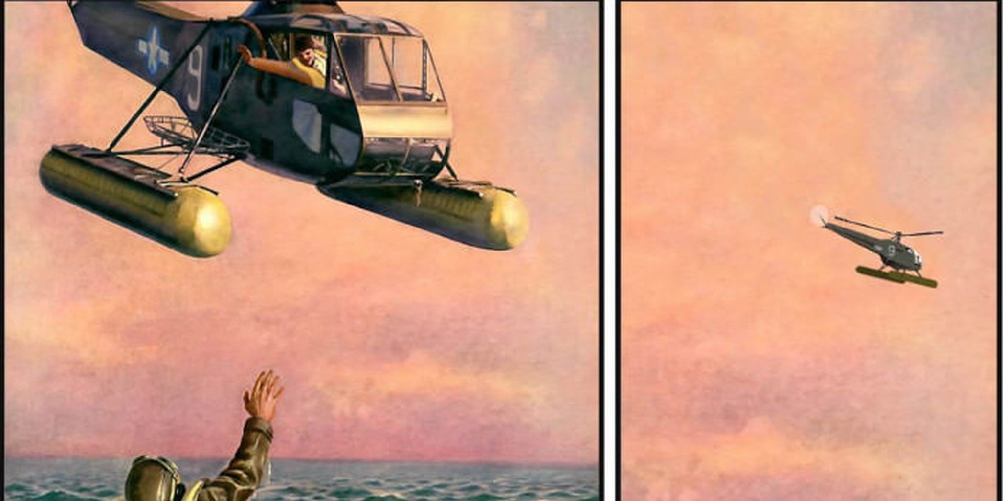 Imgurians have lately loved turning one man's grim fate into a premise for all kinds of jokes. The formula stems from this two-panel comic of a man obviously in need of some help—he's floating in the sea—being spotted by a rescue helicopter, only for the pilot to fly away.