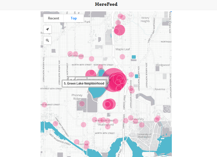 But a new Web app (which is fully responsive for mobile) called HereFeed makes Instagram eavesdropping easier and more beautiful. After requesting to use your location, HereFeed surfaces pink bubbles, indicating areas being Instagrammed. This creates a real-time heat map of Instagram uploads.