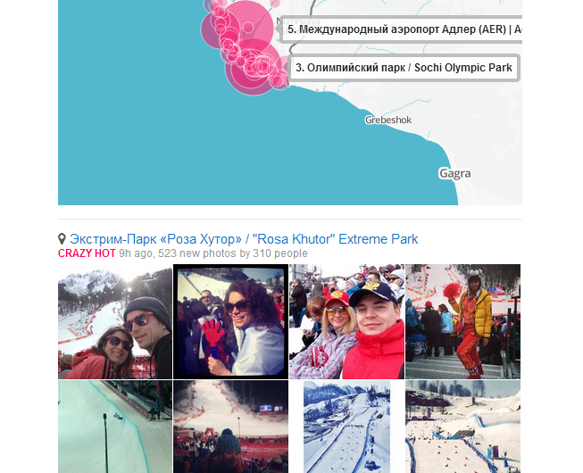 Right now, HereFeed only has live feeds for a few cities and areas (Sochi, San Francisco, Silicon Valley, New York City, L.A., Las Vegas, and San Diego). When you look at any part of the world that isn’t listed, you’ll see top locations in that area (in my own neighborhood, there’s a surplus of gym selfies, brunch, and beer-related activities going on).