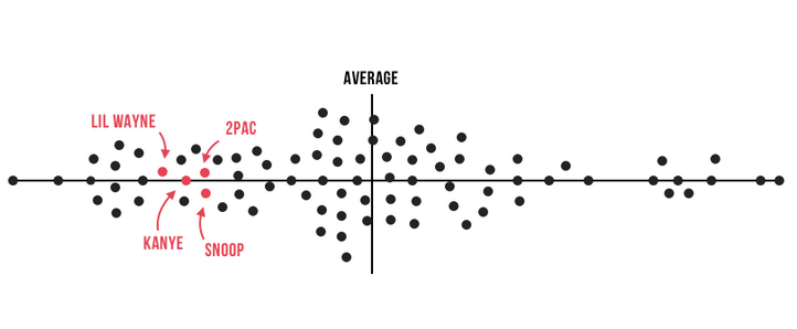 Surprisingly, Kanye West, 2Pac, Lil Wayne, and Snoop Dogg—four of the biggest names in rap history—fell in the bottom 20 percent.