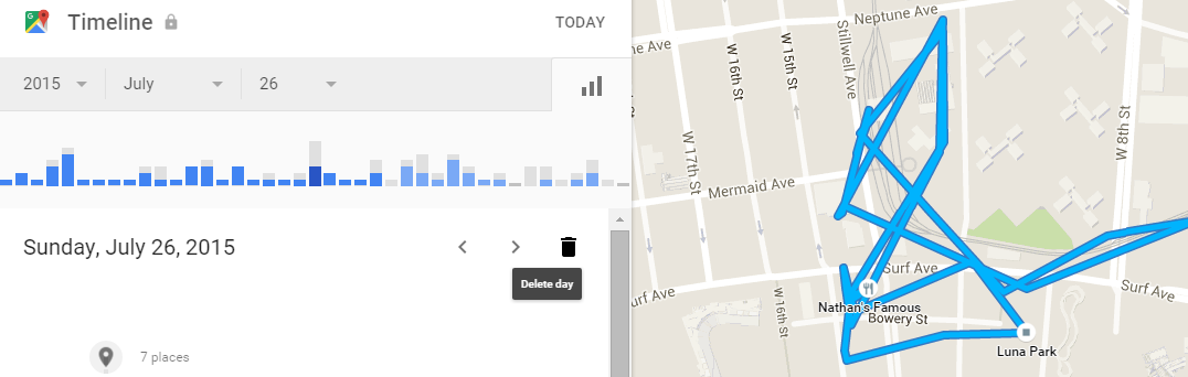 If you want an entire day gone, that’s easy, too. From Google Timeline’s homepage, navigate to the day in the top left. Click the garbage bin. The day is gone.