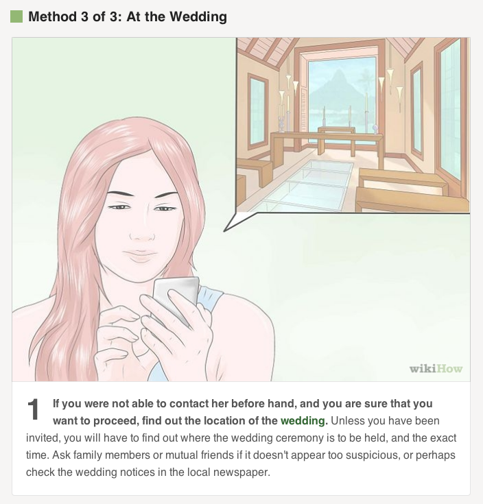 If you want to Benjamin Braddock someone and you’re not into spontaneity, WikiHow has a surprisingly detailed and beautifully illustrated guide to stopping a wedding. The authors repeatedly suggest ways to stop the wedding without shouting down the bride and groom at the altar. But they do consider that an option. Things you’ll need, according to the guide, include “a prepared speech, wedding details, and the confidence to speak your mind.”