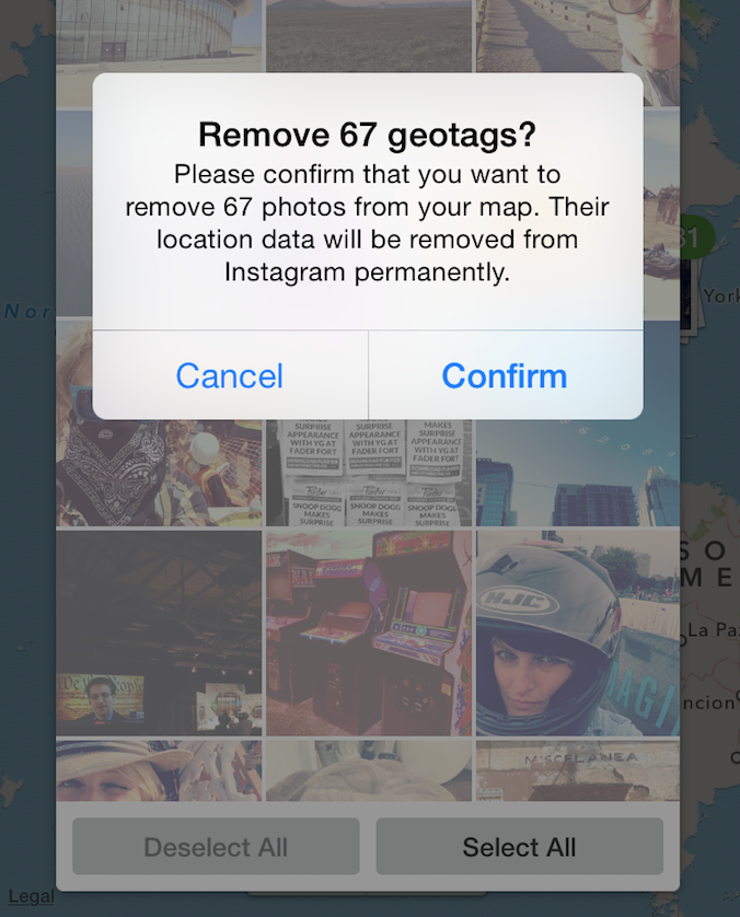 Here's the confusing part: You'll be met with a grid of your photos from that location and only two buttons, "Select All" and "Deselect All." There's no wording about removing geotags or deleting location data at all. It's not obvious, but if you choose Deselect All > Done, you'll be met with a pop-up message confirming that you want to remove X number of geotags. Click confirm and your historical whereabouts will be wiped from the map. Phew.