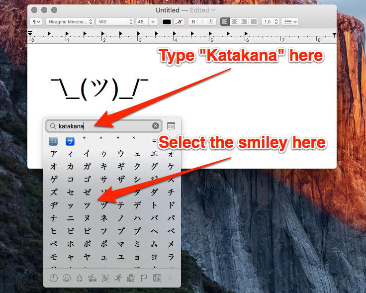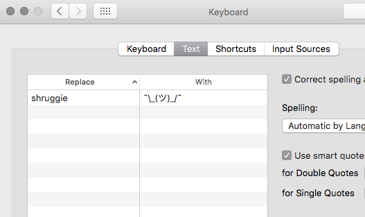 Go into your System Preferences and click on Keyboard, and then the Text tab. Here you can create a shortcut command for the shrug emoji. Type a command word like "shruggie" into the Replace column, and then copy and paste the emoji into the With column. Now, whenever you type "shruggie" the emoji will take its place.