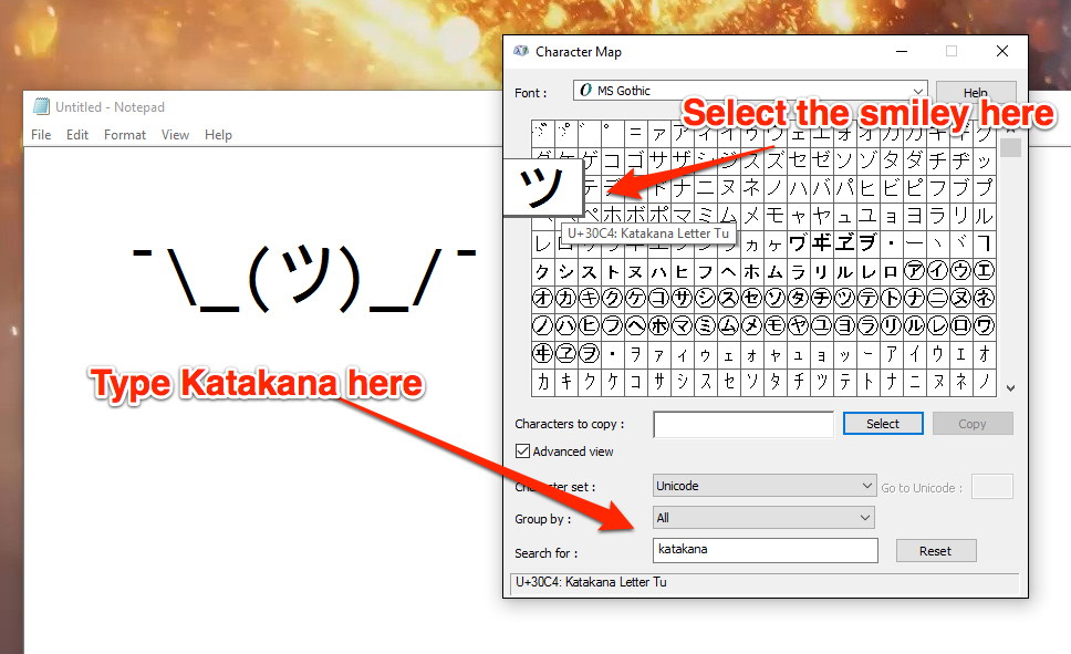 Once open, you can search for the katakana "TU" character as well as the overlines required for the beginning and end of the shruggie.