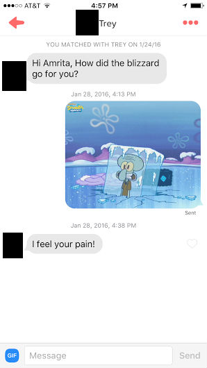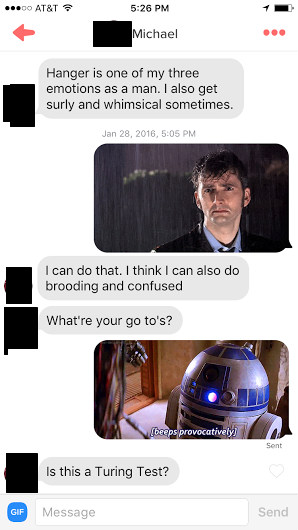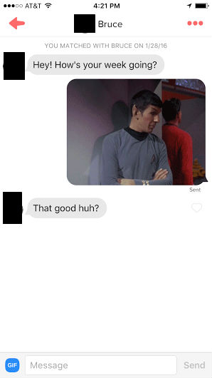 GIFs are also excellent responses for situations when you have no words. Maybe your Tinder match makes a reference to Game of Thrones and you've haven't seen the show? Maybe they greet you in Klingon and you're not fluent in Klingon? It might be a good idea to send a GIF in order to turn the conversation back to them.