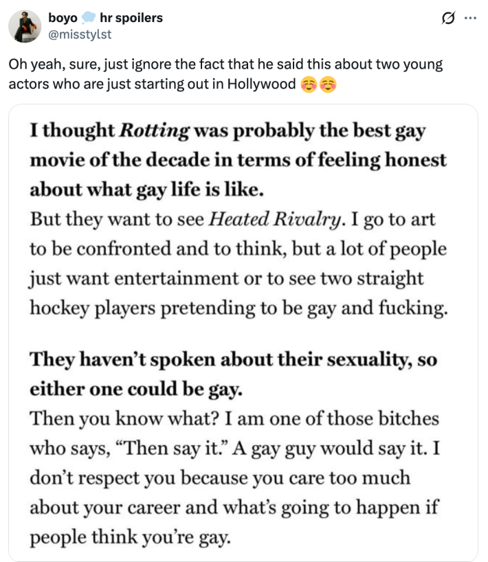 @misstylst wrote sarcastically, "Oh yeah, sure, just ignore the fact that he said this about two young actors who are just starting out in Hollywood ☺️☺️" They shared a screenshot from Firstman’s interview where he talked about actors needing to come out to play queer roles.