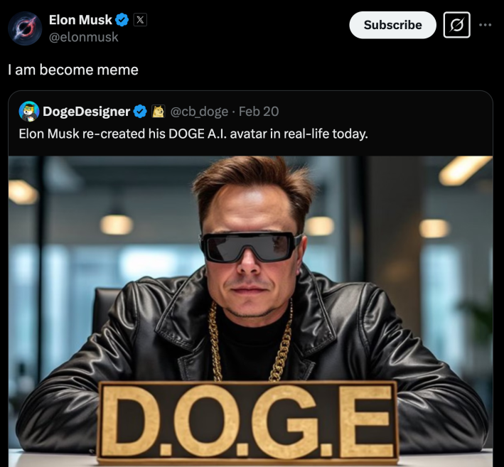 Musk's reasons for warping the quote into "I am become meme" are not quiet as poetic. His explanation for the statement came down to saying that he's "living the meme." Later the same day, he said it in response to a fan account on X pointing out that he dressed up like an AI image of him behind a "DOGE" sign.
