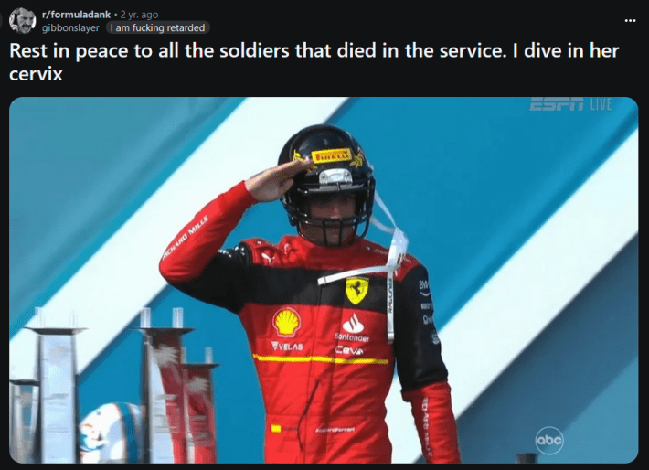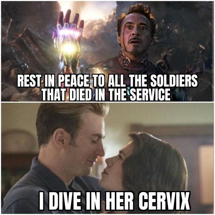 The "I dive in her cervix" meme references the song "U Da Realest" by rapper 2 Chainz. The comedic value of the line is enhanced by the fact that it immediately follows a shout-out to the troops, and its sexual nature paired with a provocative image assured that it would catch on as a viral joke.