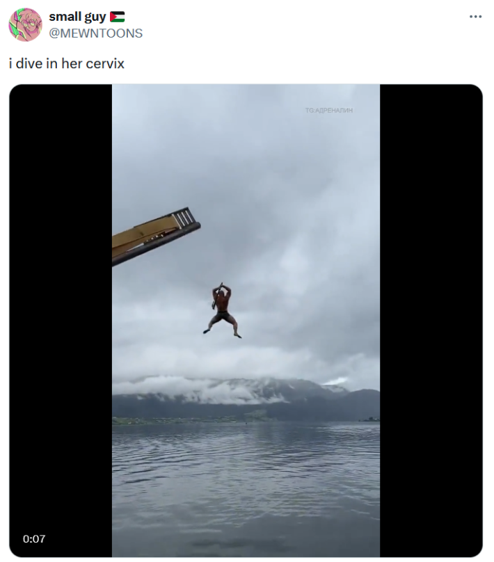 From that moment in 2021, social media posts featuring the "I dive in her cervix" line skyrocketed. In addition to images and gifs that included references to military service, the lyric was paired with music videos from other bands, pride flags, sexual moments in popular films and TV shows, and not uncommonly with footage of that guy who likes to plummet into bodies of water with a battle axe.