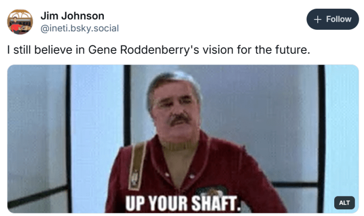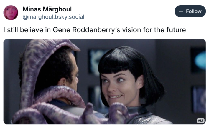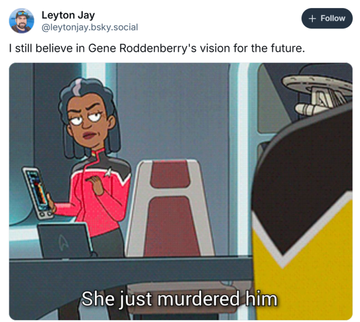 The "I still believe in Gene Roddenberry's vision for the future" copypasta, which originated on BlueSky in February 2025, captures this contrast using screencaps from Star Trek to humorously highlight the disconnect between the franchise’s lofty ideals and its sometimes questionable execution.