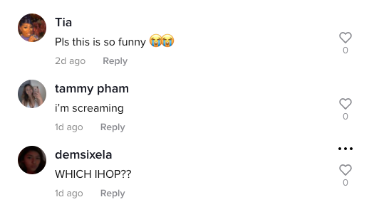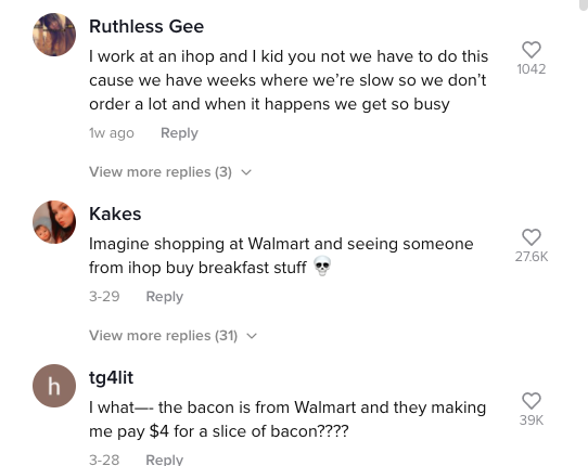 A TikTok user claiming to work at a different IHOP commented on the video explaining why employees have to make Walmart trips. “I work at an ihop and I kid you not we have to do this cause we have weeks where we’re so slow so we don’t order a lot and when it happens we get so busy,” wrote @ruthlessxgee619.