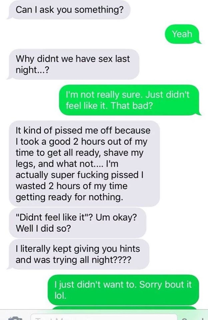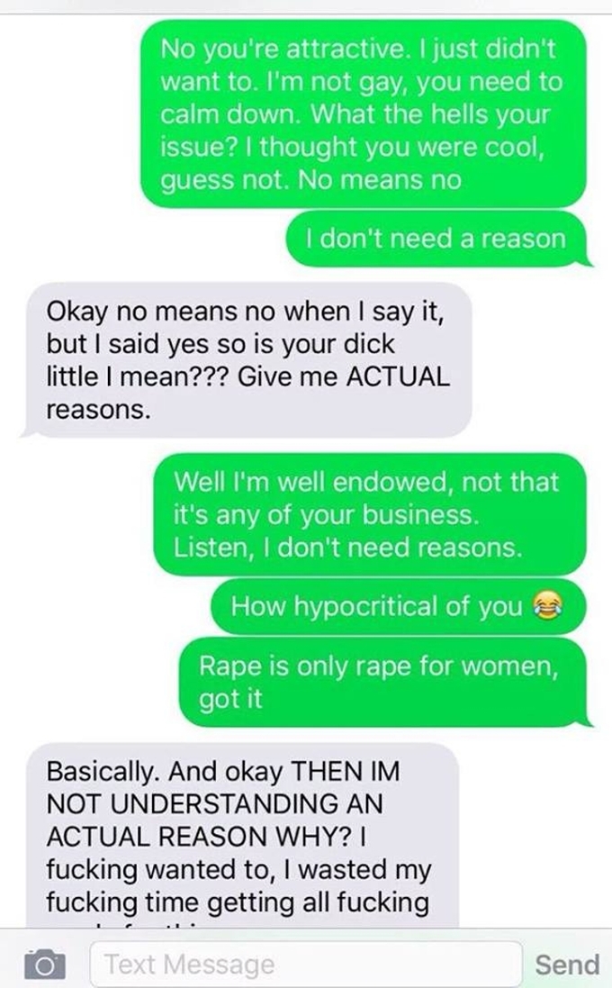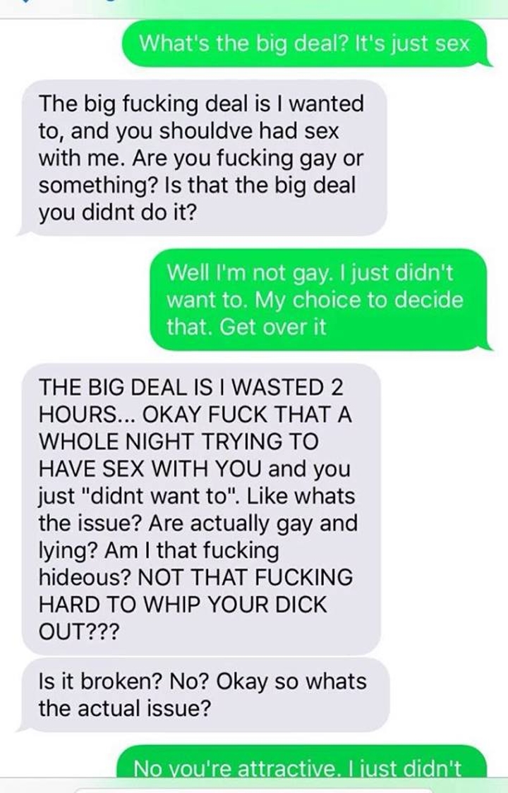 A harassing text exchange from a woman refusing to accept that a man didn't want to have sex with her is causing quite a conversation today.