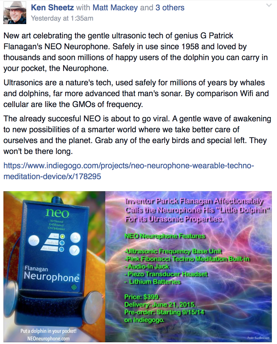 “For the first 20 years after it was invented,” the Indiegogo campaign tells us, “Dr. Flanagan’s Neurophone was kept under government lock and key for intense study … before the doctor managed after great effort to free his Neurophone for the general public.”
