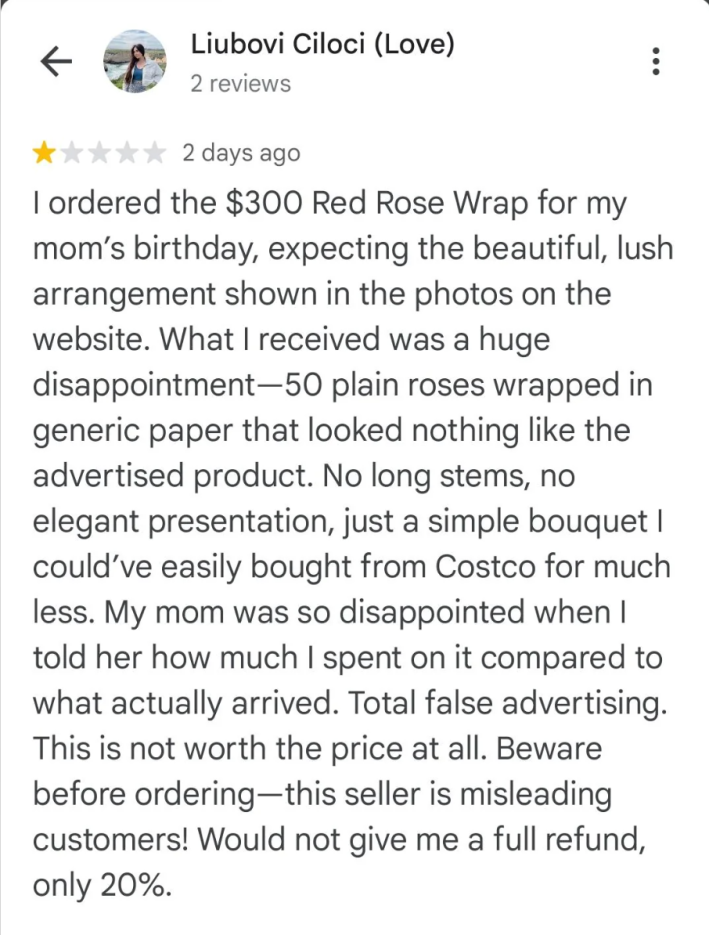 Apparently, the entitled customer felt that the roses she was given were different from what she saw in the photos on the website. The owner suggested the difference might be attributable to the fact that the flowers were prepped for transport, or maybe she thought the arrangement would be larger because the owner herself, who is 4’11", was holding them in the picture.