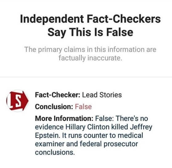 "There's no evidence Hillary Clinton killed Jeffrey Epstein," Instagram's explanation states. "It runs counter to medical examiner and federal prosecutor conclusions."