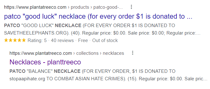 "It does not cost 8 dollars to ship something with virtually no production costs via TWO MONTH snail mail," it wrote two months ago. It claims that Plant a Tree Co., whose necklace brand shares the name of an apparently unaffiliated jeweler in California, makes $6 profit per necklace, $1 of which it's supposed to donate to planting trees or other various causes.