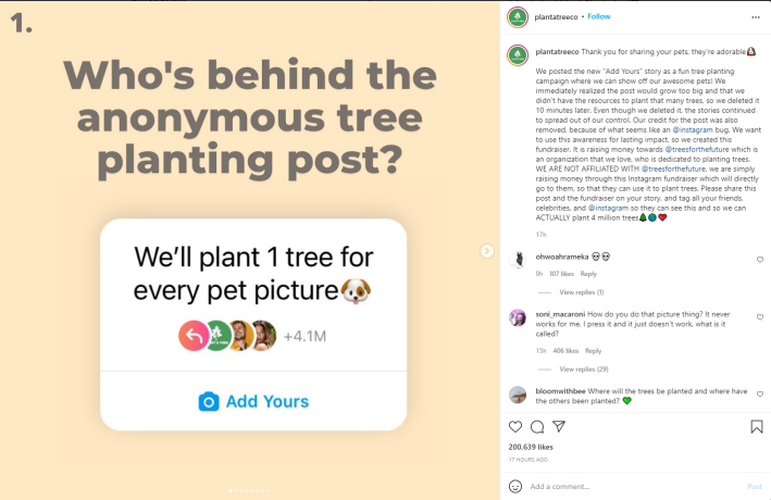 It seemed like a cute way to show off your pet and help the environment. A recent Instagram sticker campaign promised a tree would be planted for each pet picture Instagram users posted. Unsurprisingly, the sticker rapidly went viral. To date, more than 4 million people have shared it.