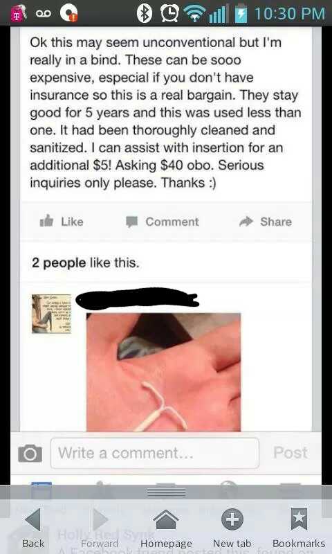 Listen, times are tough, ladies. I understand that. Jobs are scarce, the economy’s in the toilet, and Emma Watson’s haircut is so cute it makes you cry just to look at it. That having been said, even if you’re having a tough time and you’re hard up for cash, there are still certain lines you probably shouldn’t cross. Case in point: This lady selling her used IUD on Facebook for $40.